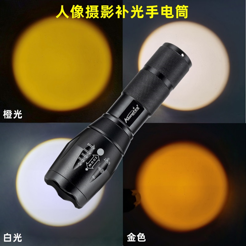 四色手电筒白黄橙红蓝绿日落补光灯伸缩变焦摄影橙光人像摄影电筒