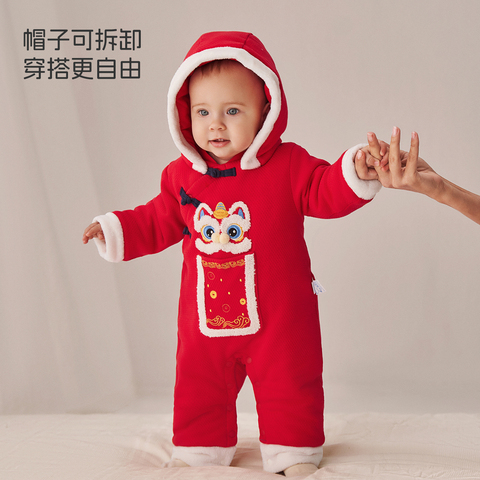 aqpa婴儿棉服连体衣新年服红色满月百天宝宝衣服哈衣