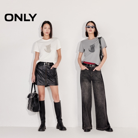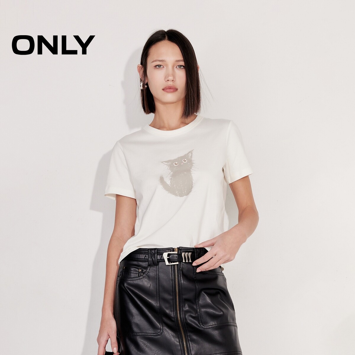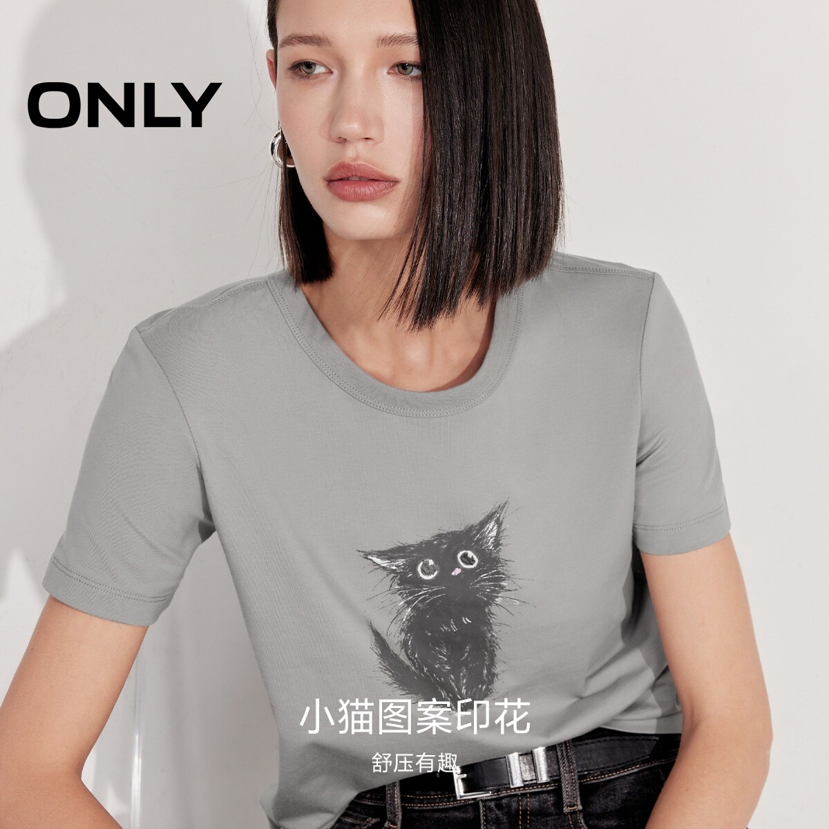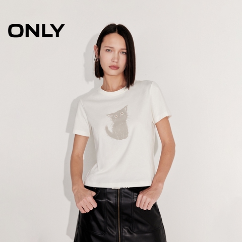 ONLY2025秋冬新款可爱小猫印花纯棉透气多巴胺圆领短袖正肩T恤女