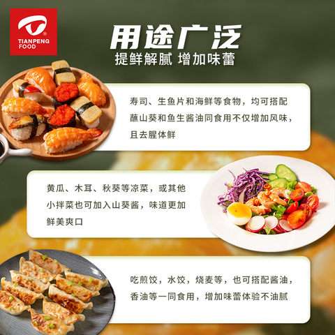 选用新鲜山葵为原料,细腻温和,有颗粒感,辣而不呛,搭配刺身 烤肉 沙拉等美味吃法,随心享受日料