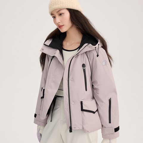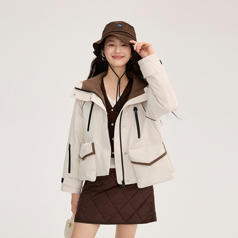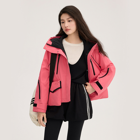 艾莱依鹅绒羽绒服女款新款撞色短款户外登山保暖时尚运动连帽外套