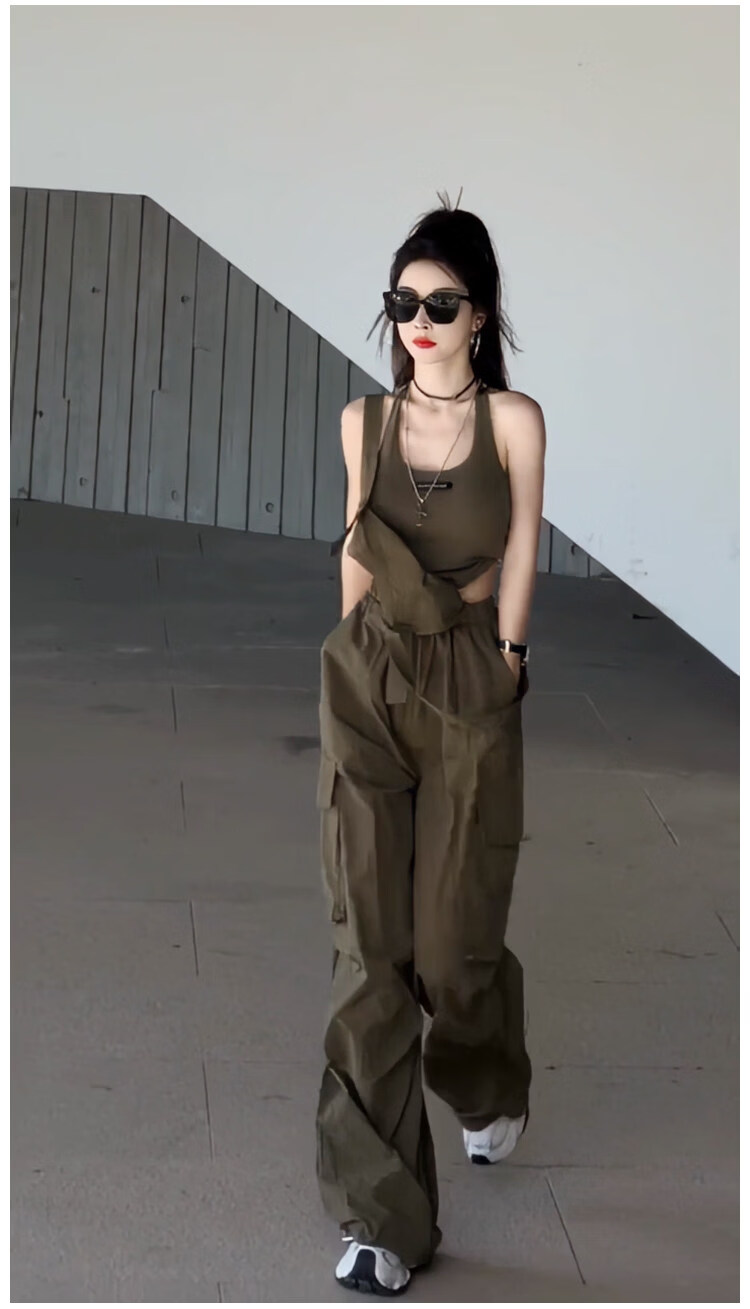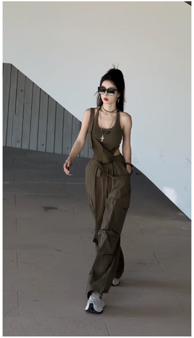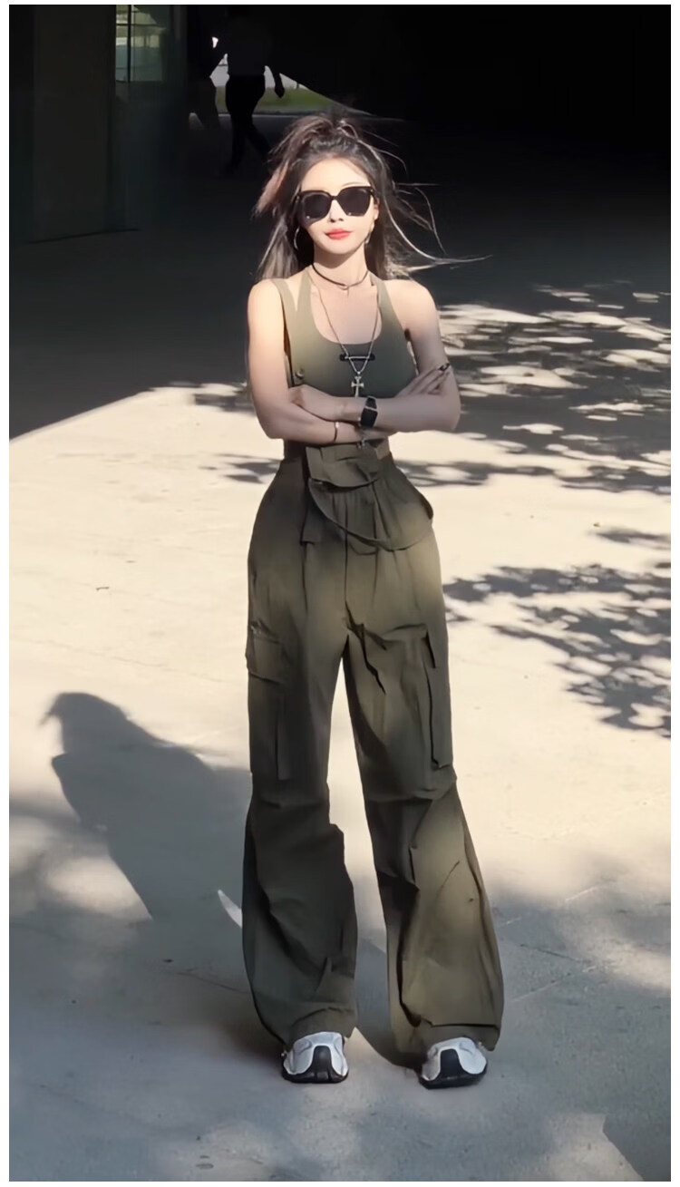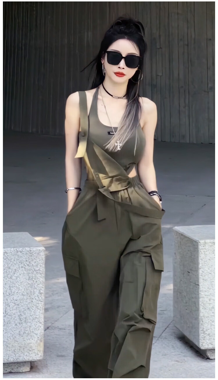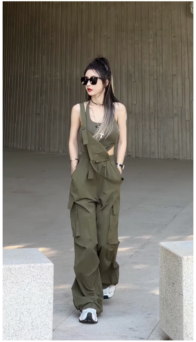 MODX设计感小众美式休闲工装背带连体裤女2025夏季高腰宽松阔腿长裤潮 军绿色背心 S