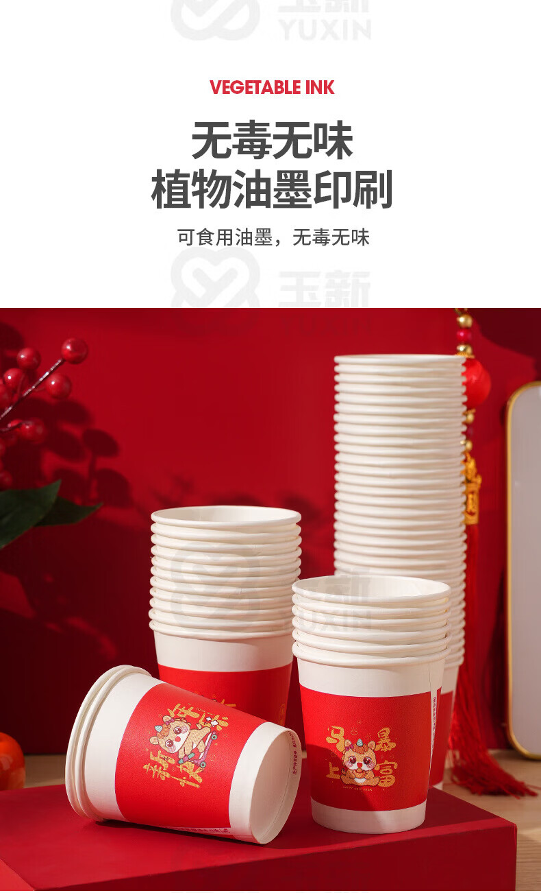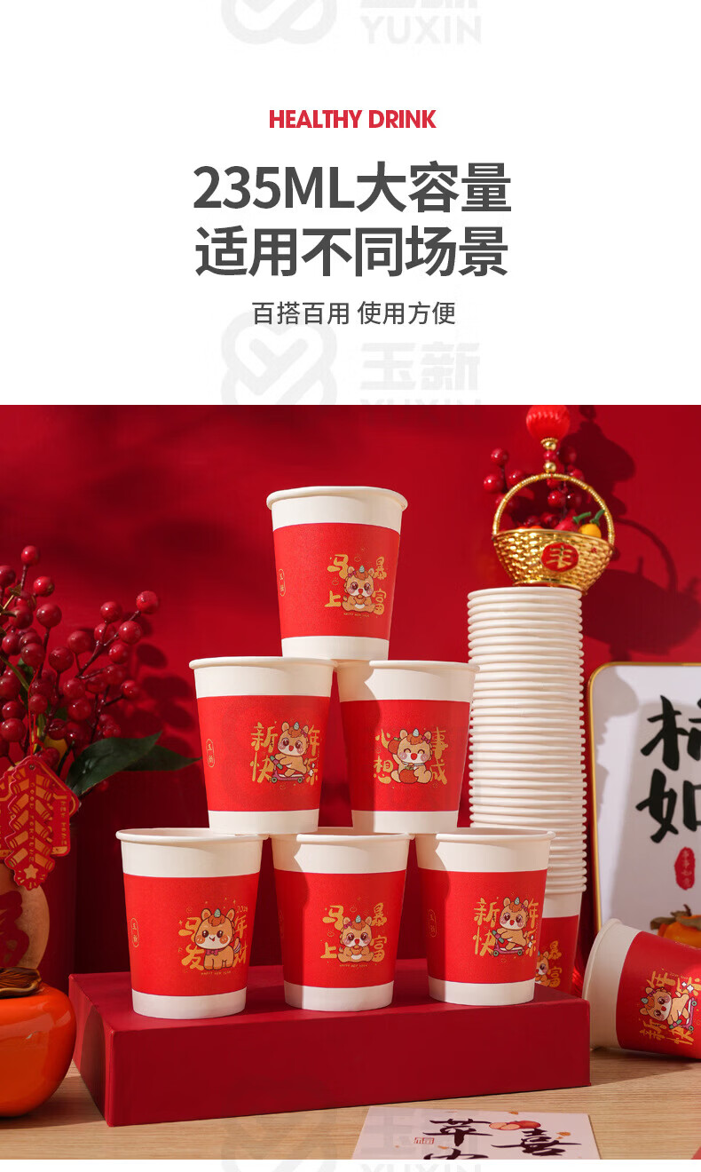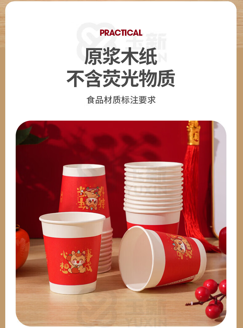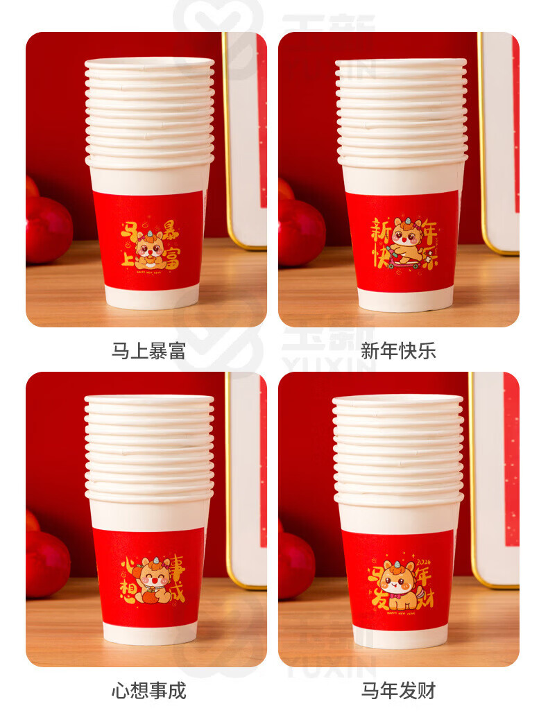 Kaooseen纸杯子一次性水杯加厚家用茶杯高档新年春节过年2026新款马年 一次性纸杯50只【马年大吉】