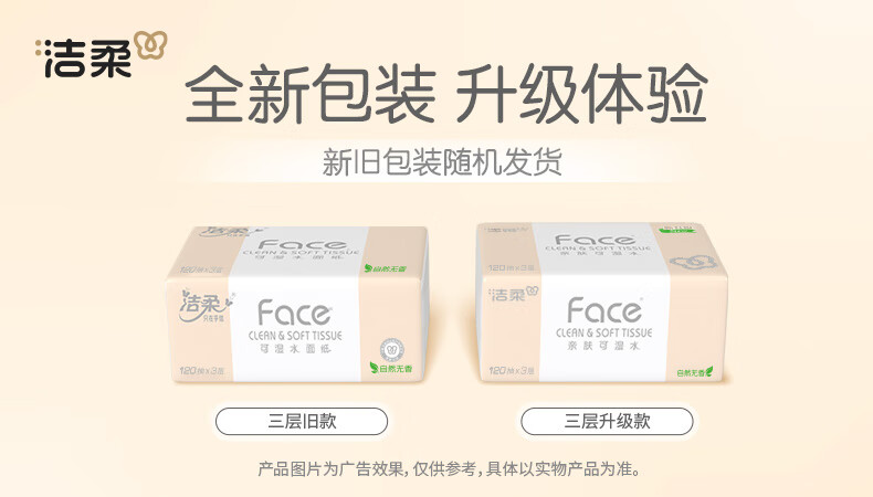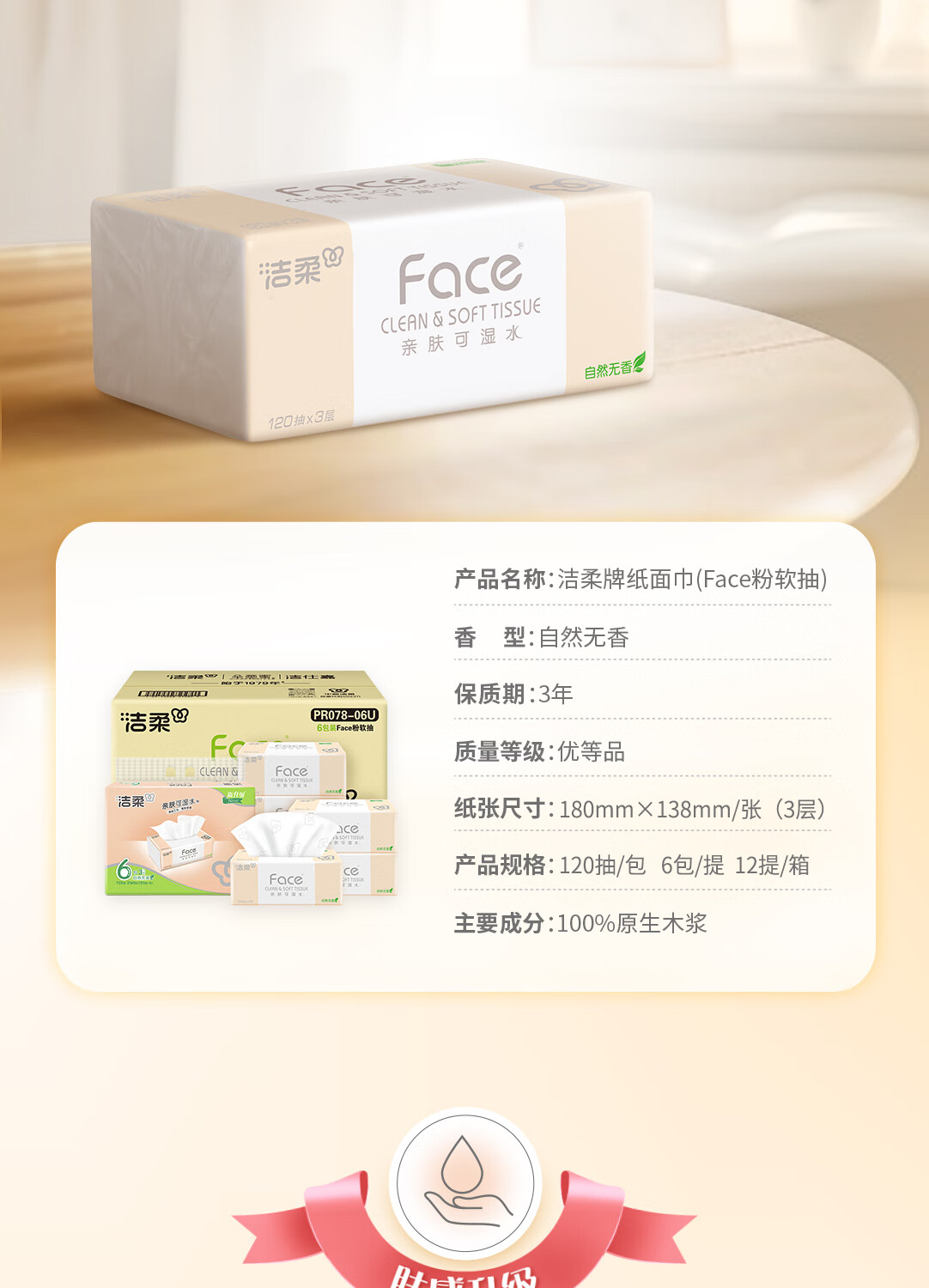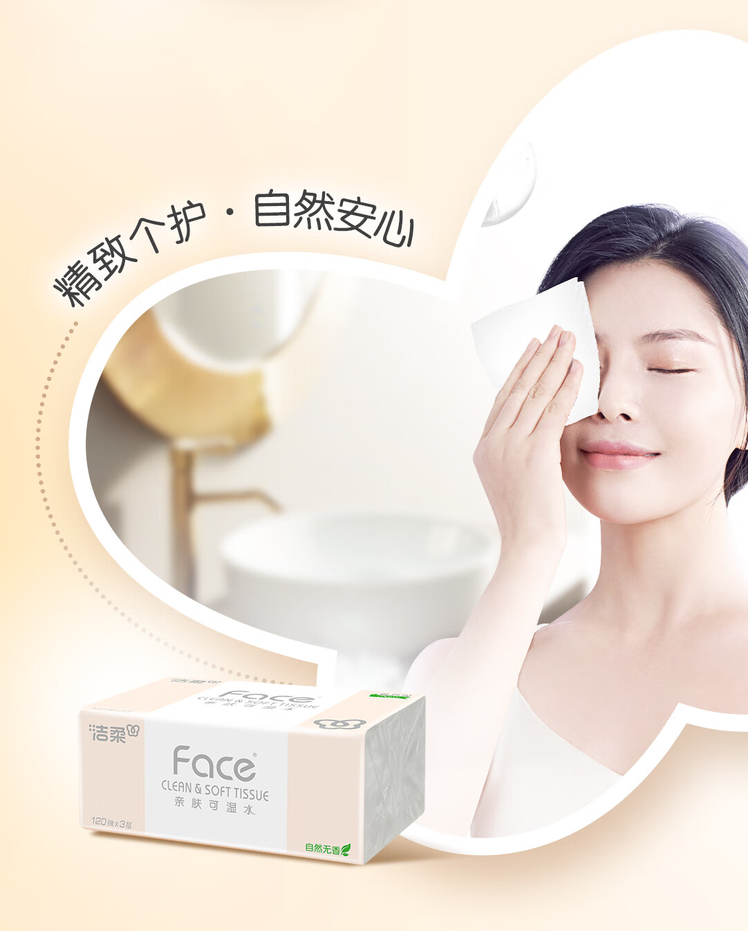 洁柔抽纸 粉Face 3层120抽72包 可湿水面巾纸 家庭囤货整箱纸巾卫生纸
