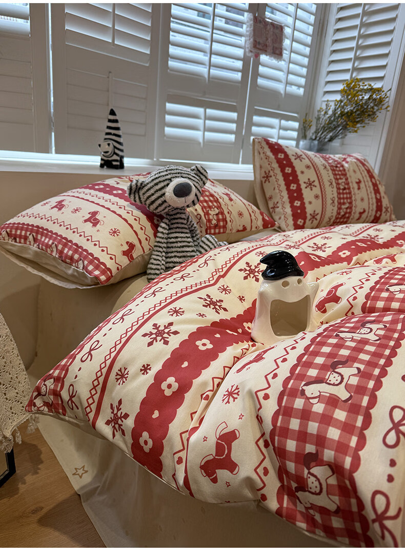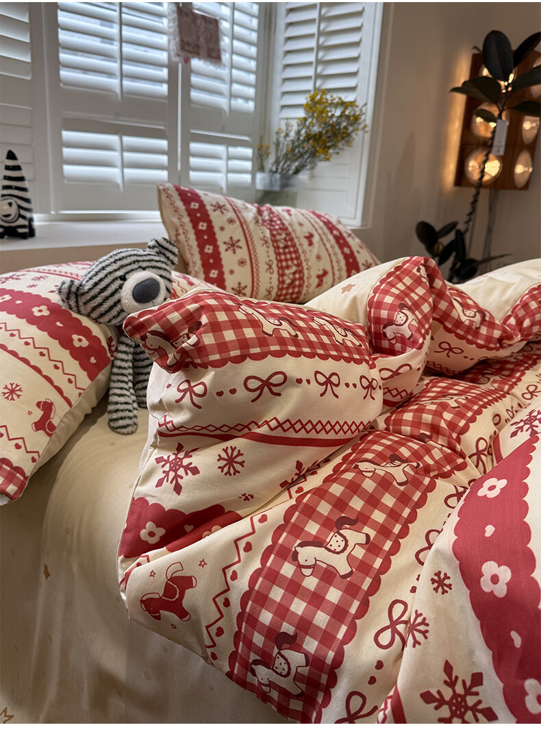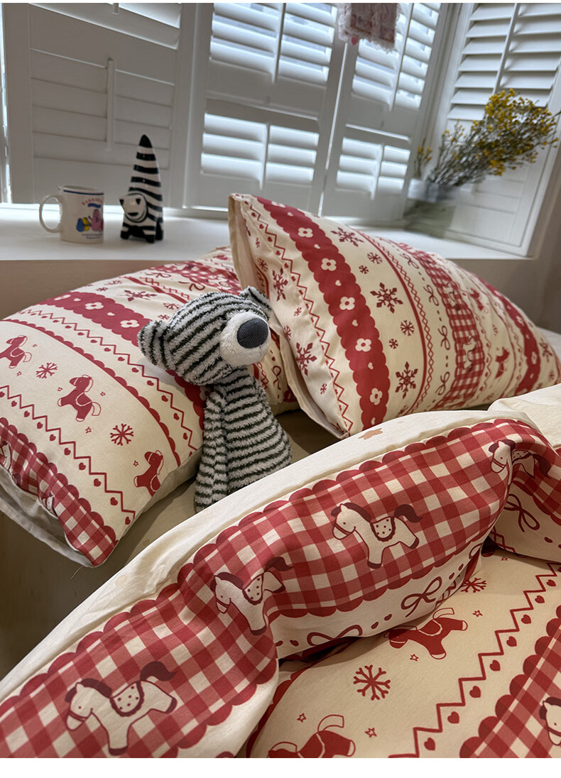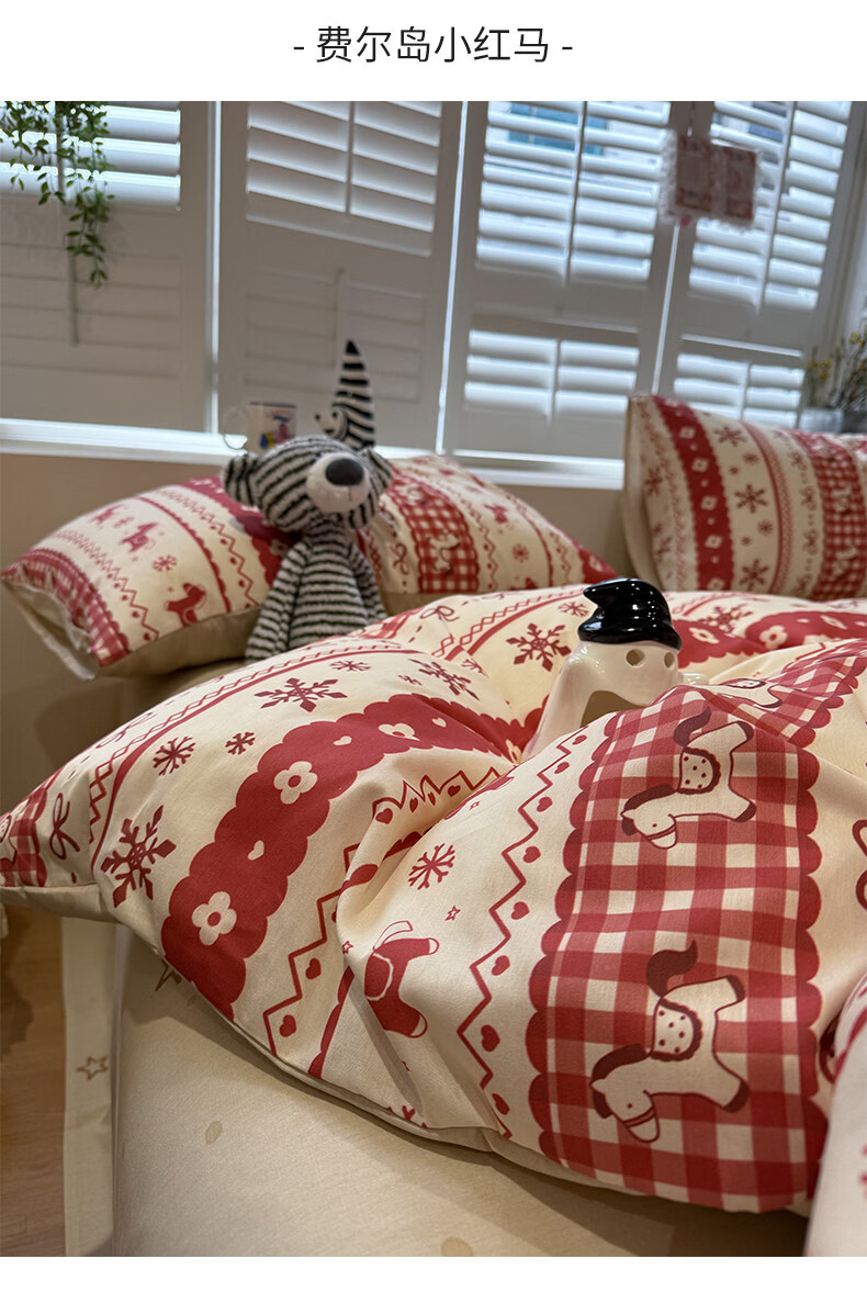 苏萱新年费尔岛小马纯棉床上四件套全棉卡通红色1.8m被套床单品三件套 熊猫总动员 1.8m 床笠款 四件套-被套200x230cm