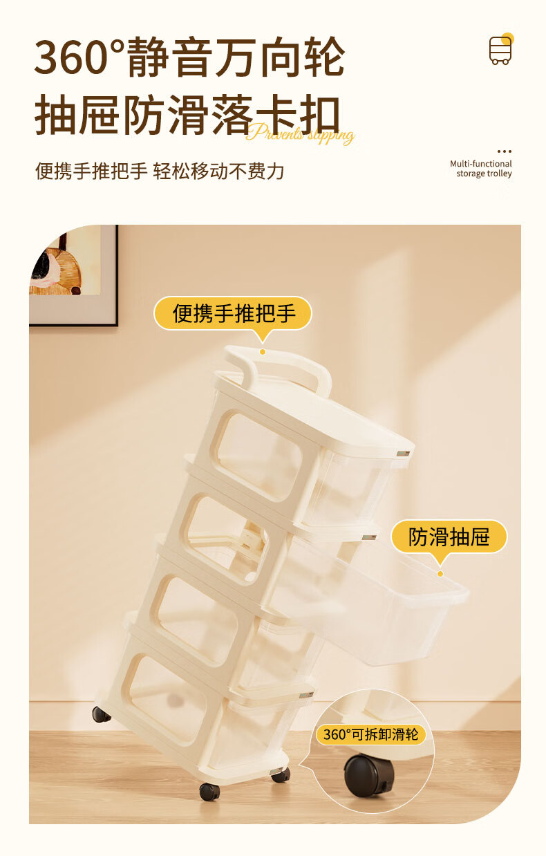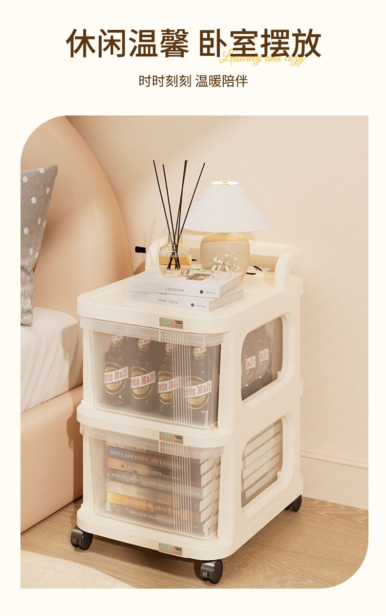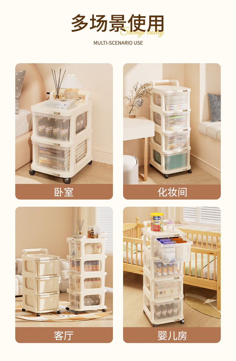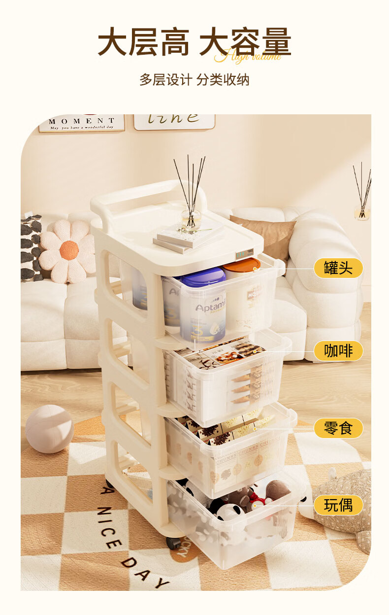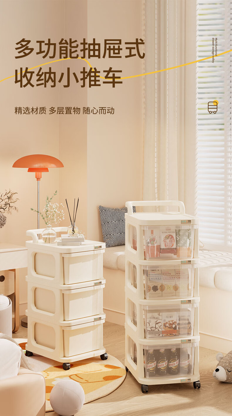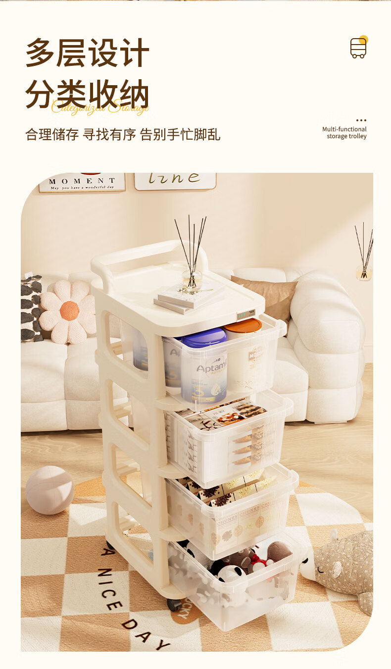 稻草熊可移动小推车整理收纳架家用客厅卧室极简轻奢落地多功能置物架子 奶油白【2层】