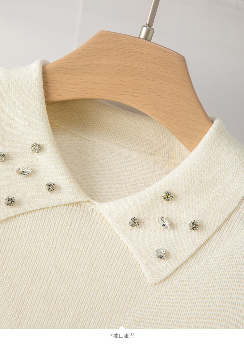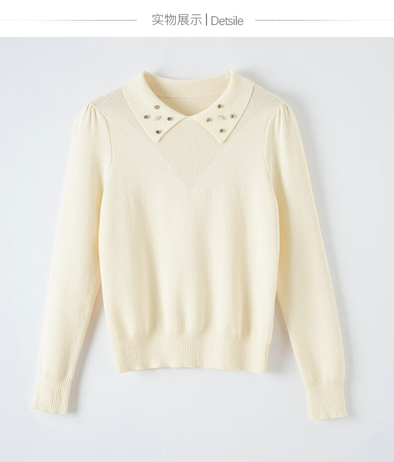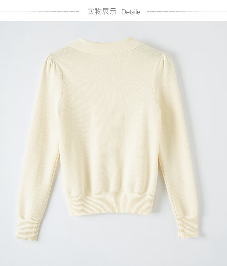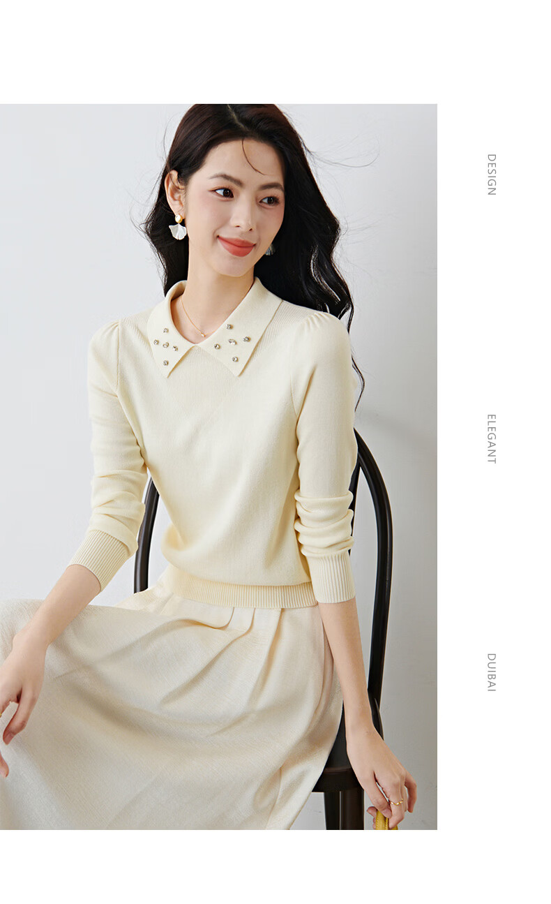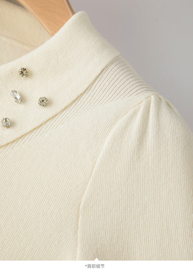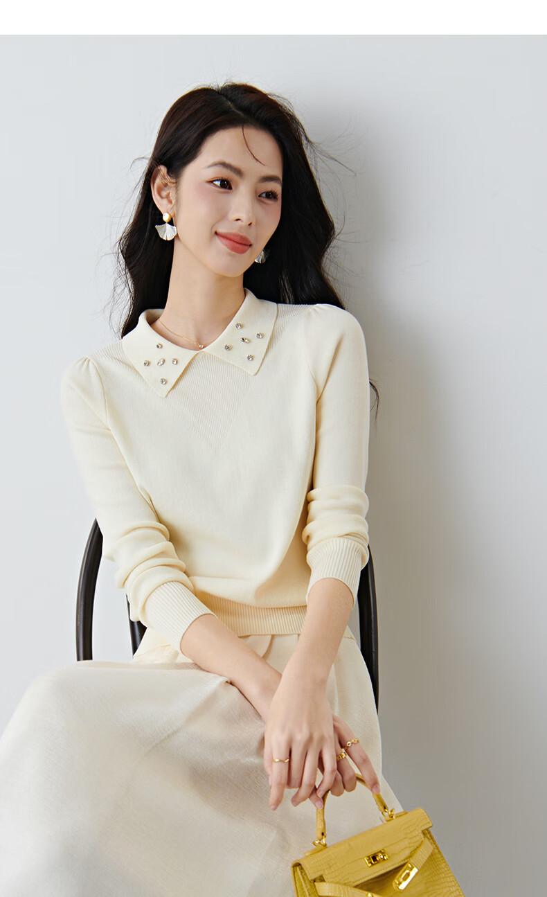 晚白2026年春款优雅甜美泡泡袖上衣重工钉珠翻领弹力温柔百搭针织衫女 米杏色 M