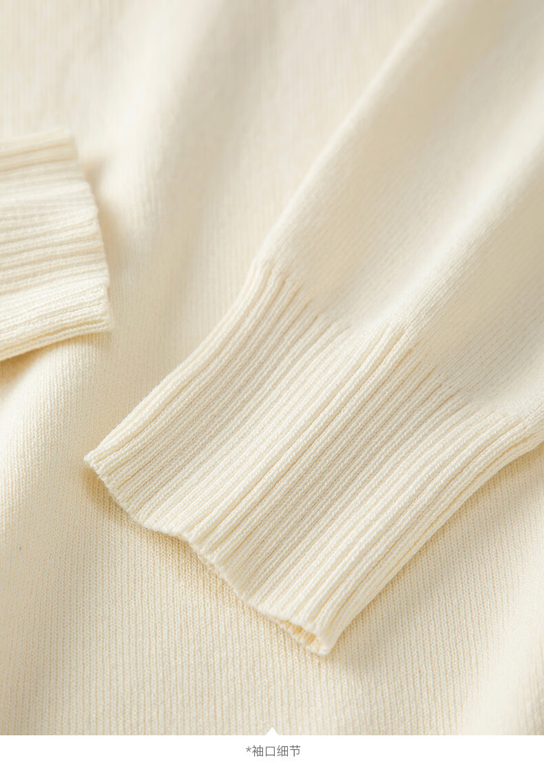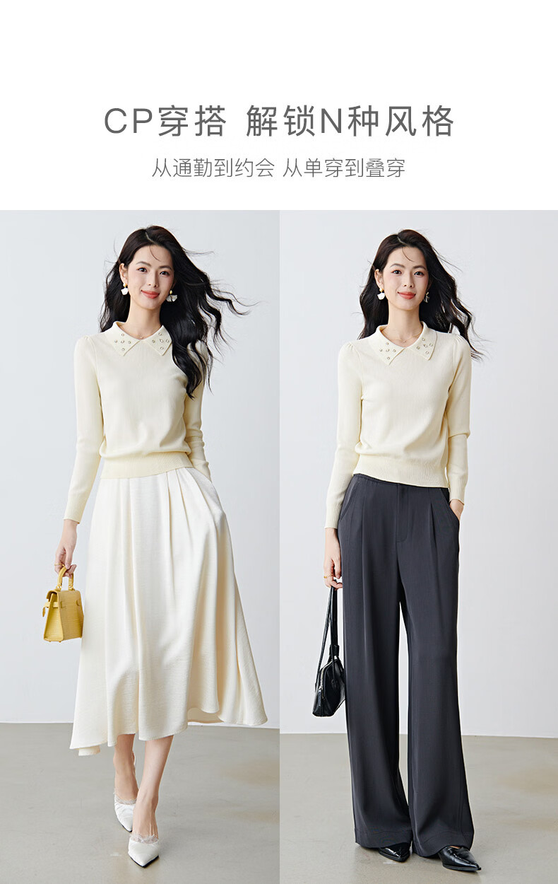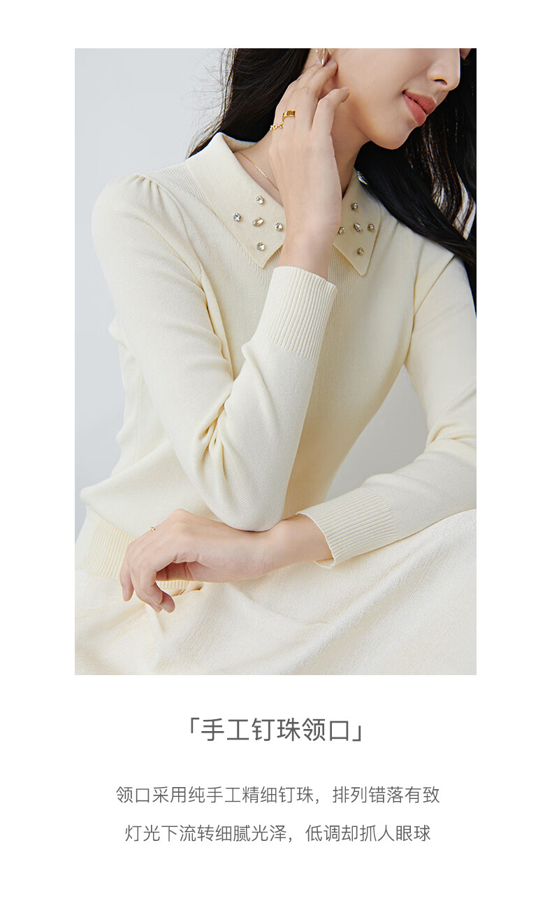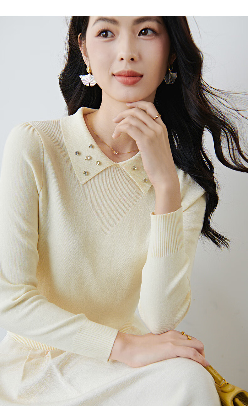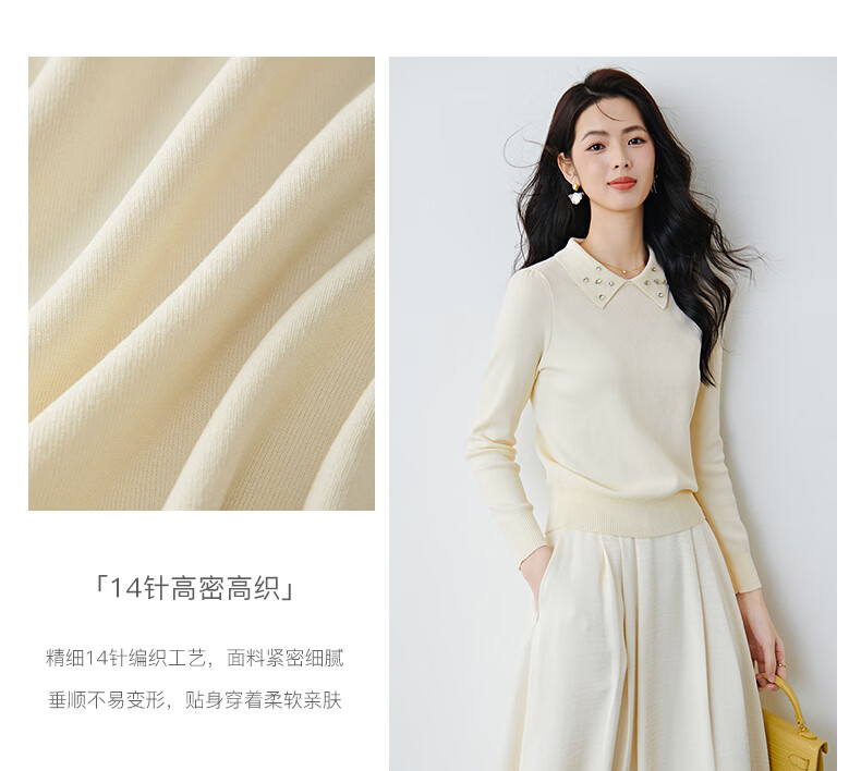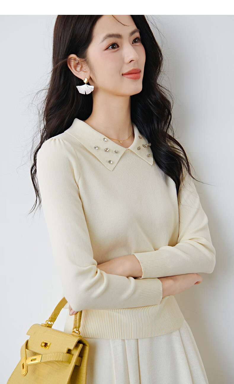晚白2026年春款优雅甜美泡泡袖上衣重工钉珠翻领弹力温柔百搭针织衫女 米杏色 M
