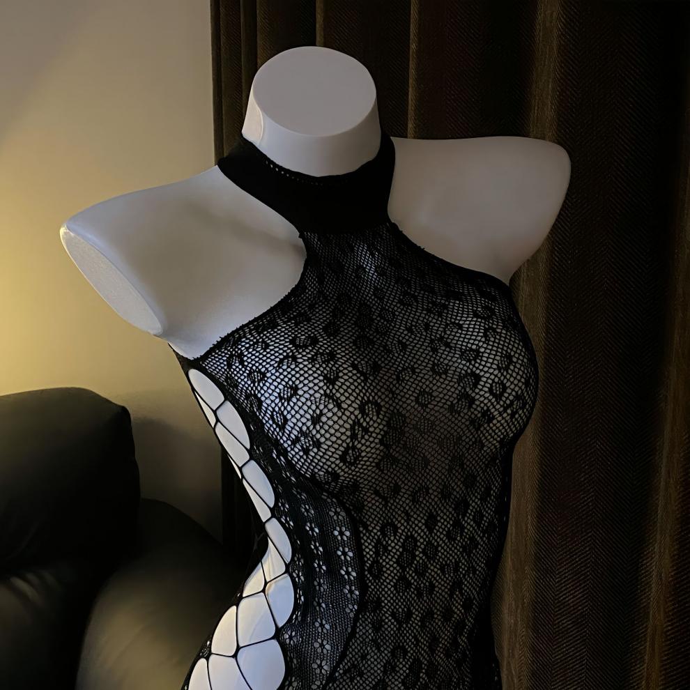 曼欲高腰设计蕾丝网纱挂脖吊带镂空性感诱人包臀纯欲睡裙 黑色 均码【80-120斤】