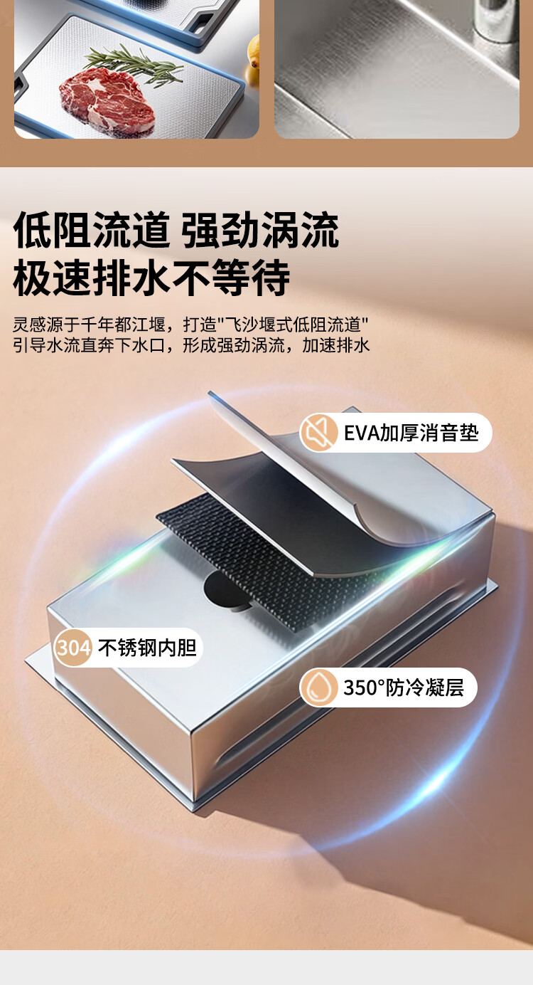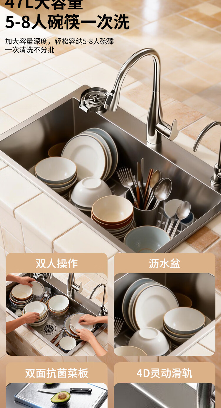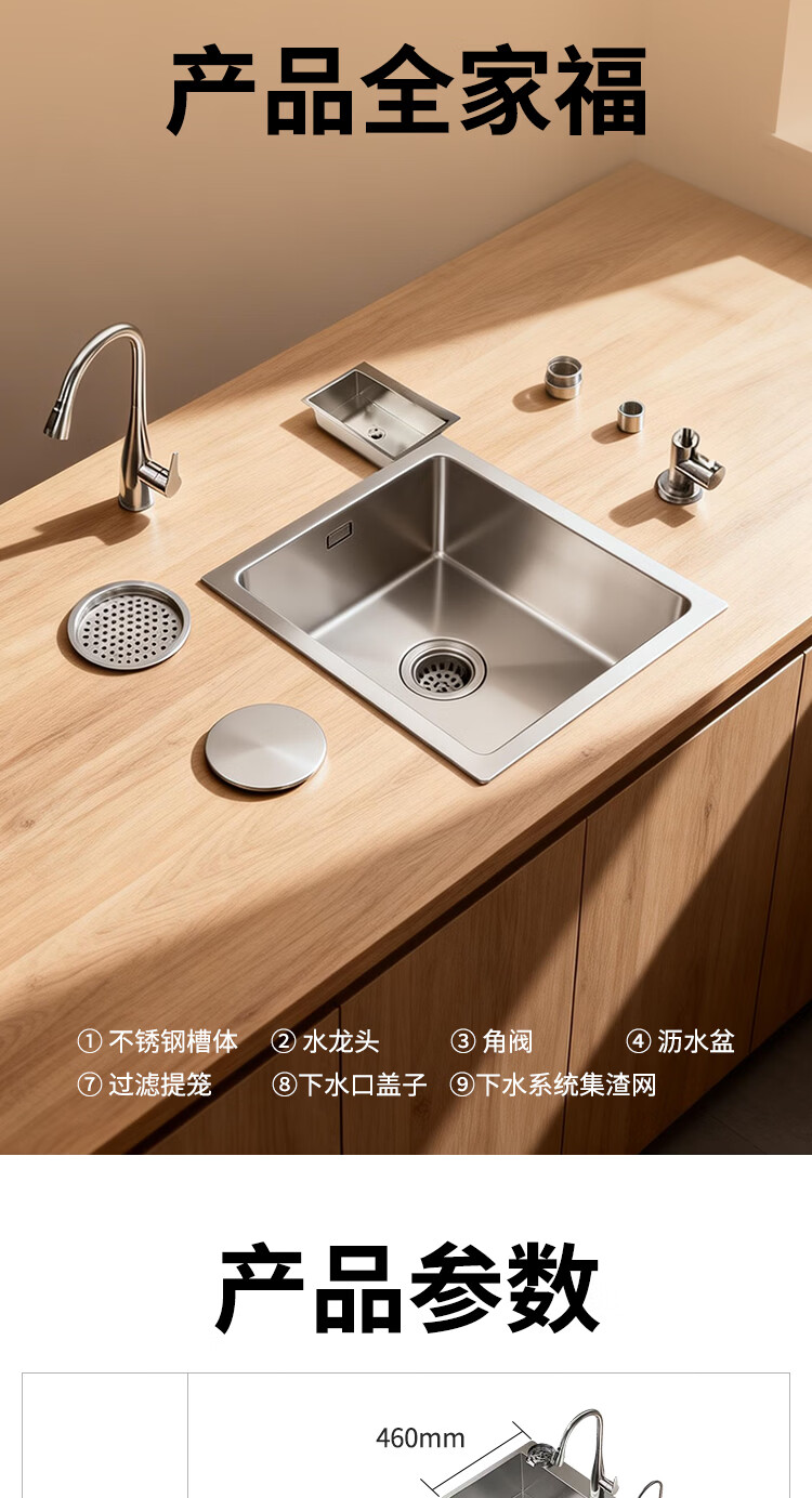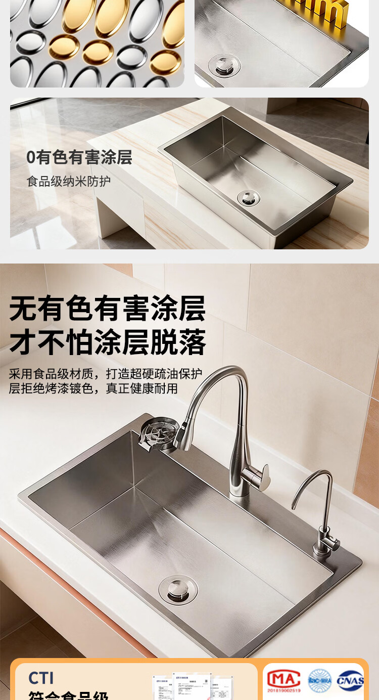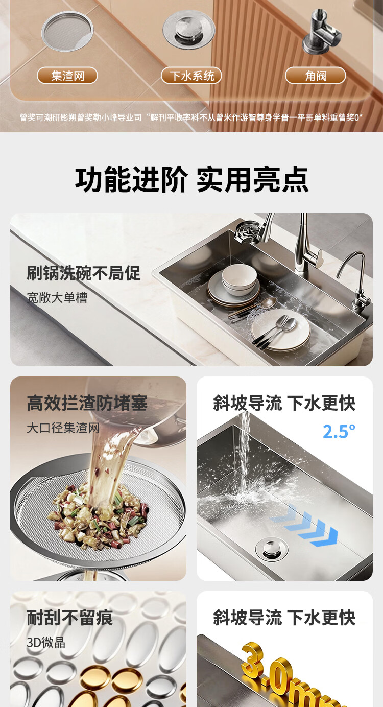日丰厨神火山压纹纳米水槽大单槽洗菜盆厨房水槽家用加厚304不锈钢 「双重加厚|弹跳过滤」76x46|精铜天鹅颈|送304盆中盆