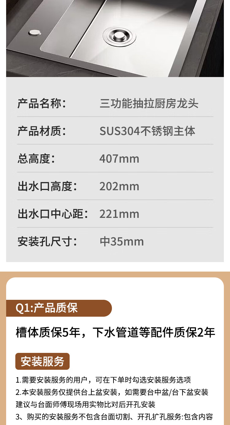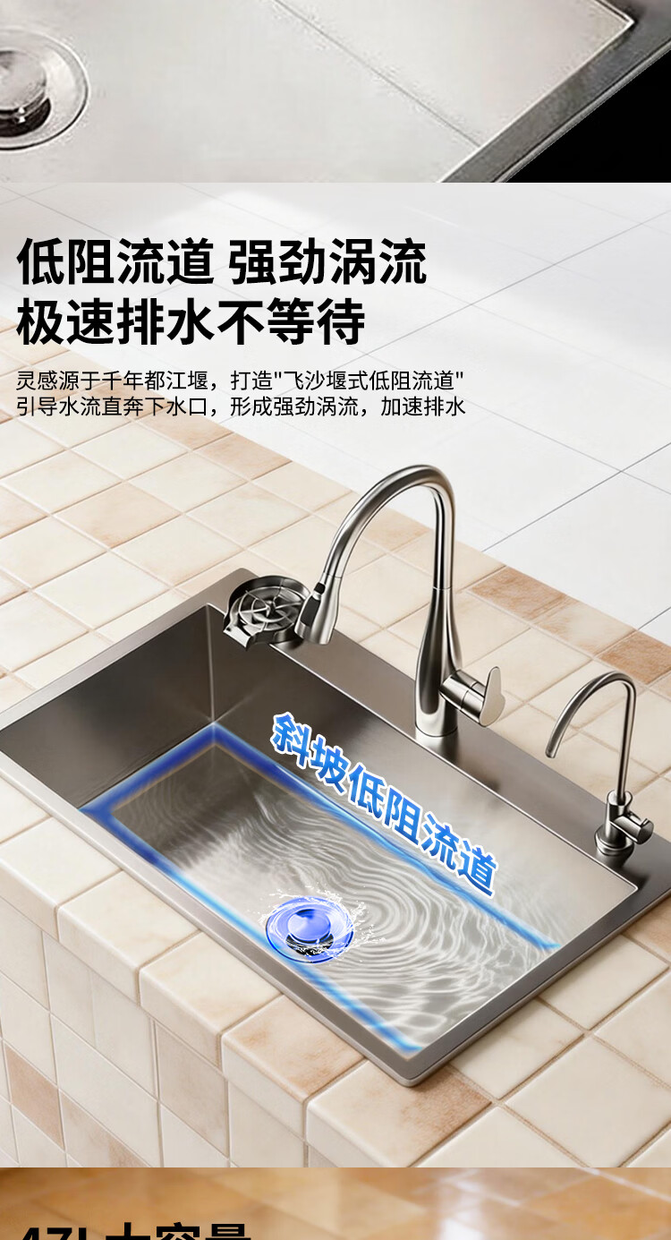 日丰厨神火山压纹纳米水槽大单槽洗菜盆厨房水槽家用加厚304不锈钢 「双重加厚|弹跳过滤」70x46|精铜天鹅颈|送304盆中盆