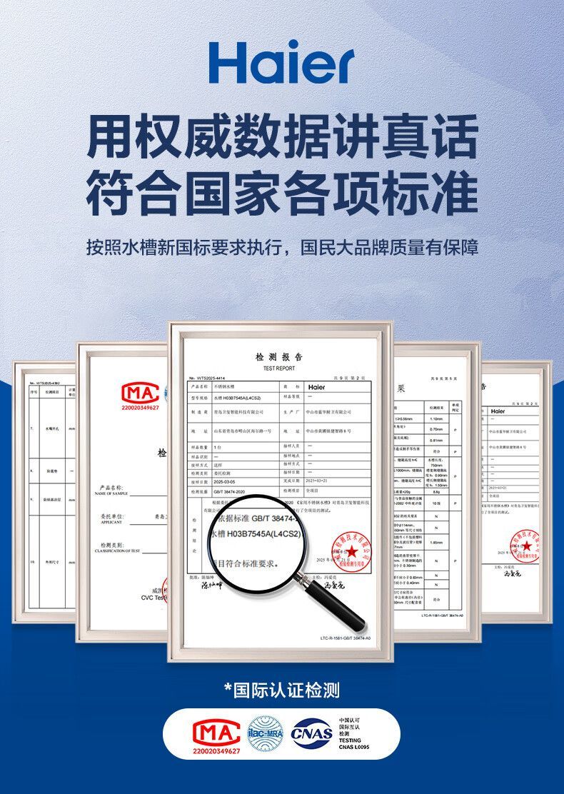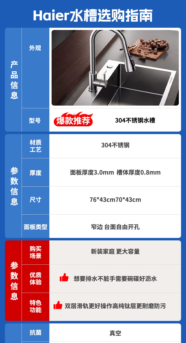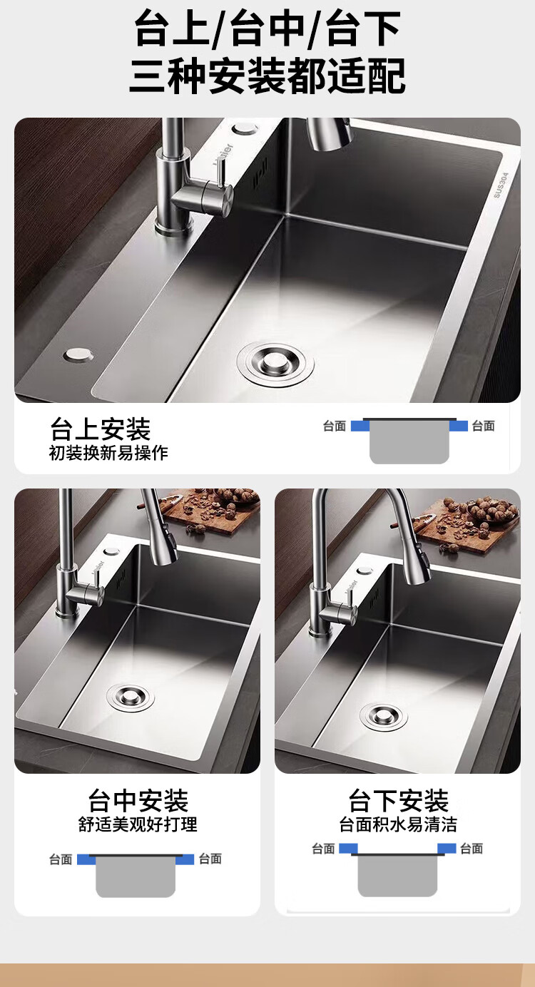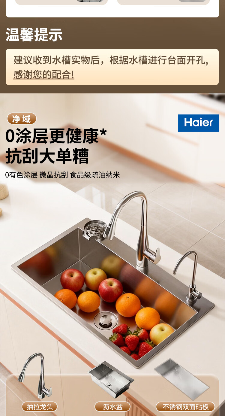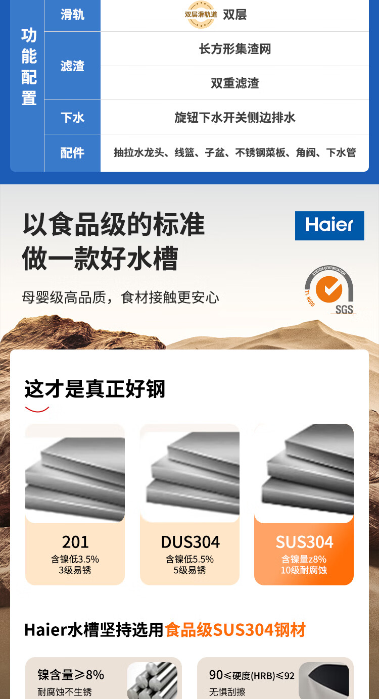 海尔加厚304纳米不锈钢水槽抽拉龙头厨房菜盆洗碗池大单槽手工槽 【SUS304不锈钢】60*45cm