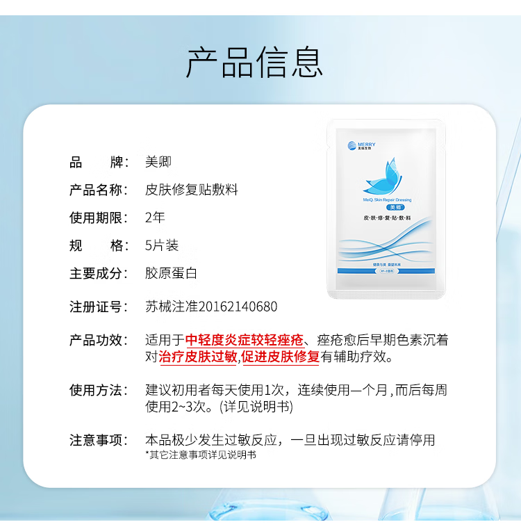 美卿皮肤修复贴敷料 蓝色版 祛痘痤疮痘印 黑头粉刺色素胶原蛋白 蓝膜基础款5片(散装)