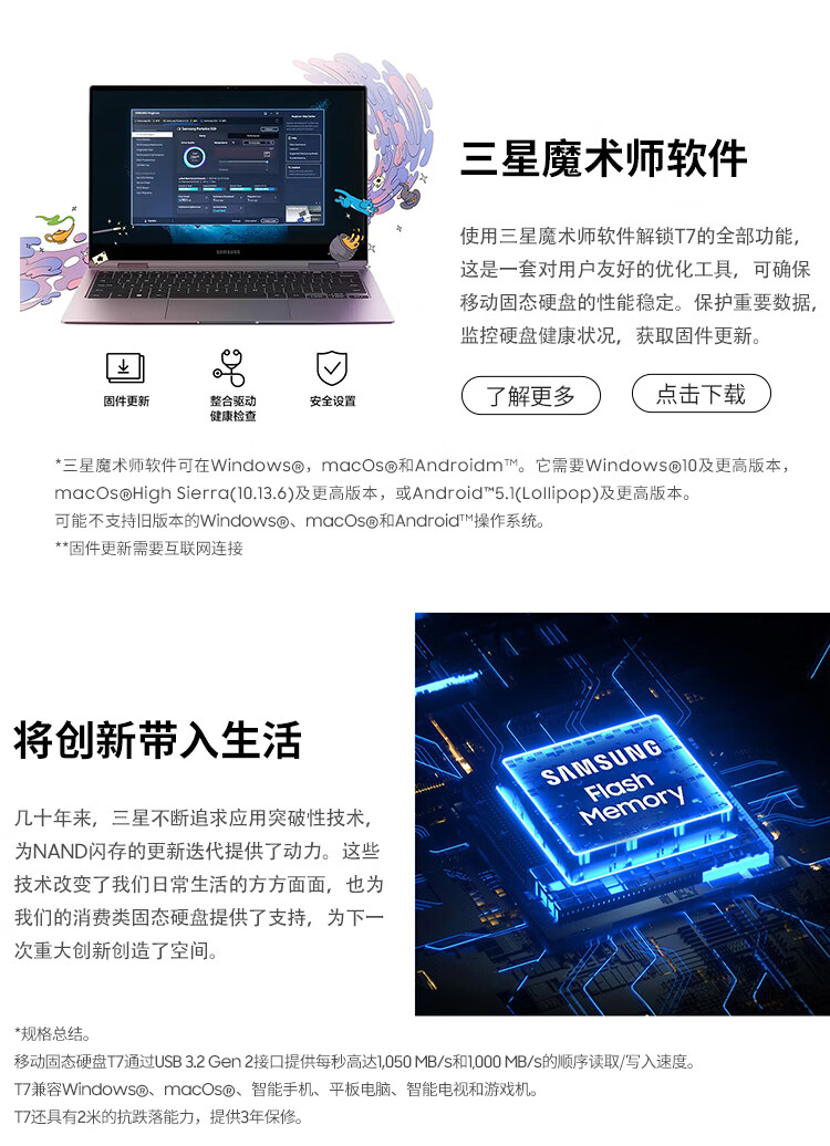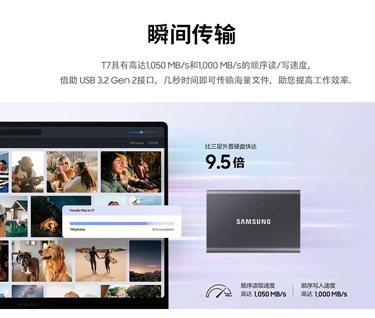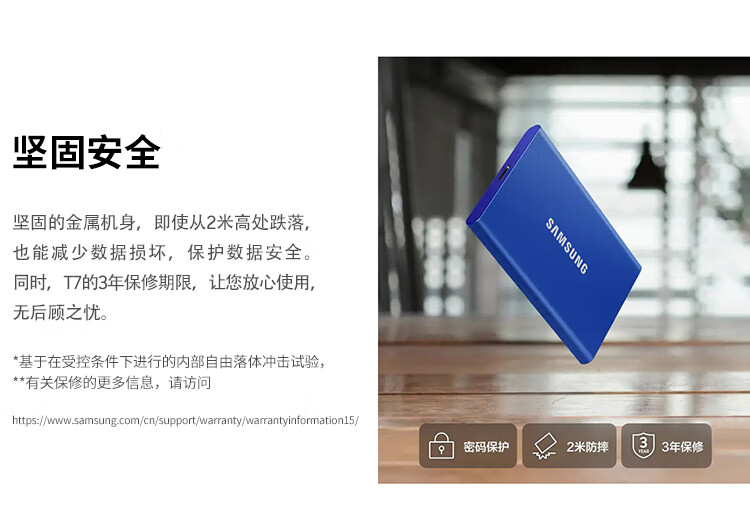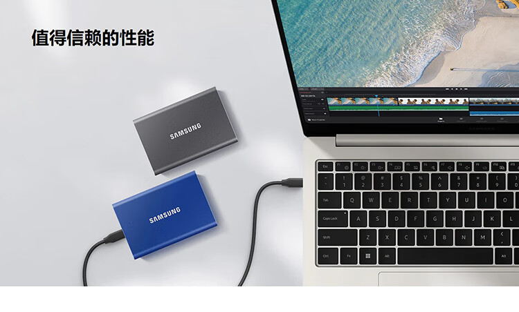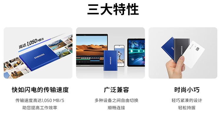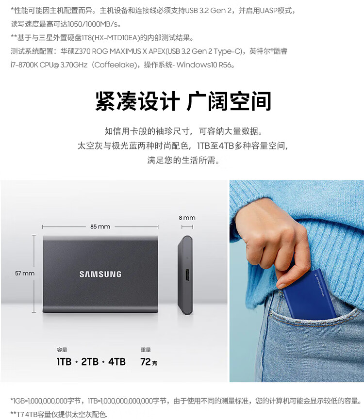三星(SAMSUNG)1TB Type-c USB 3.2 移动固态硬盘(PSSD) T7 灰色 NVMe读速1050MB/s 手机直连 Mac mini外接
