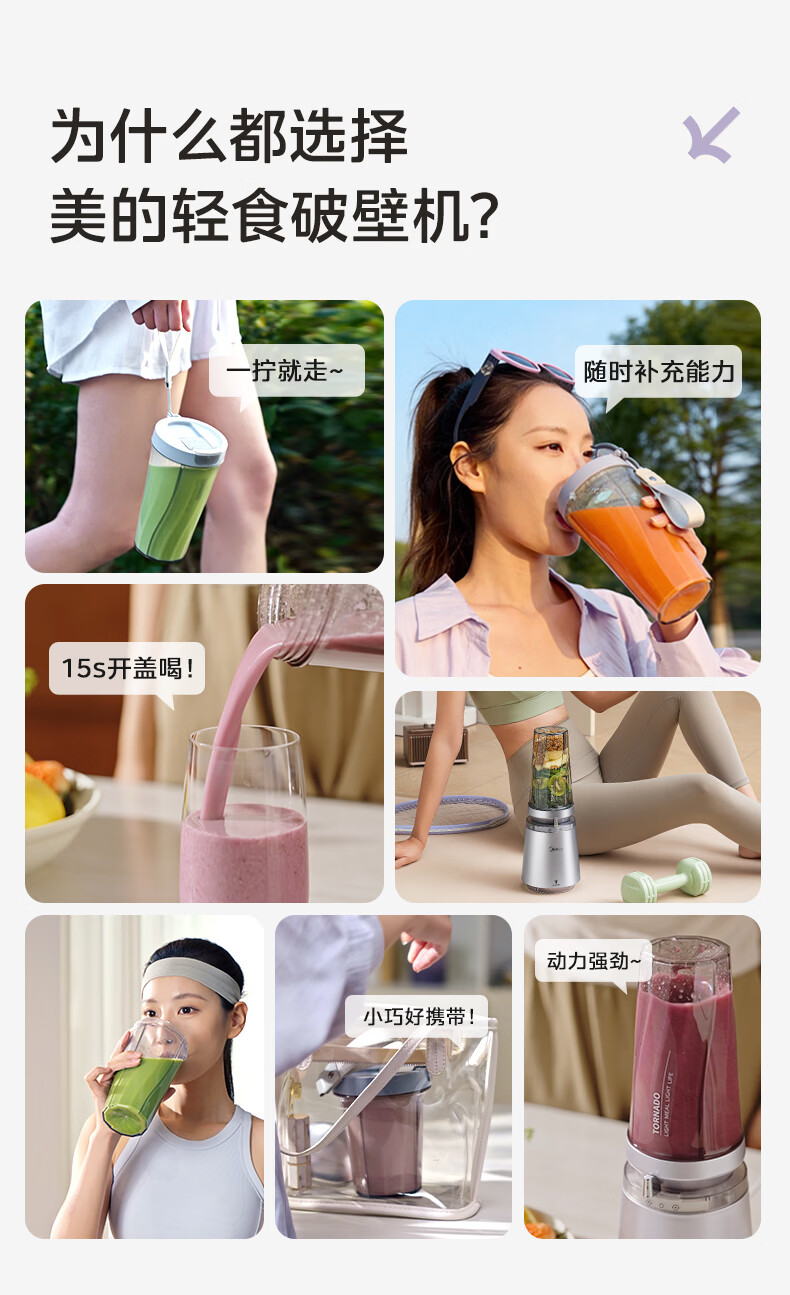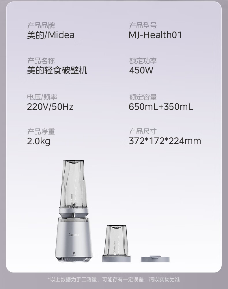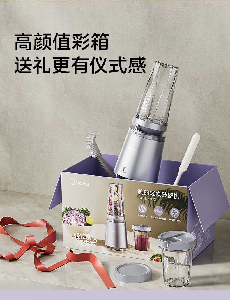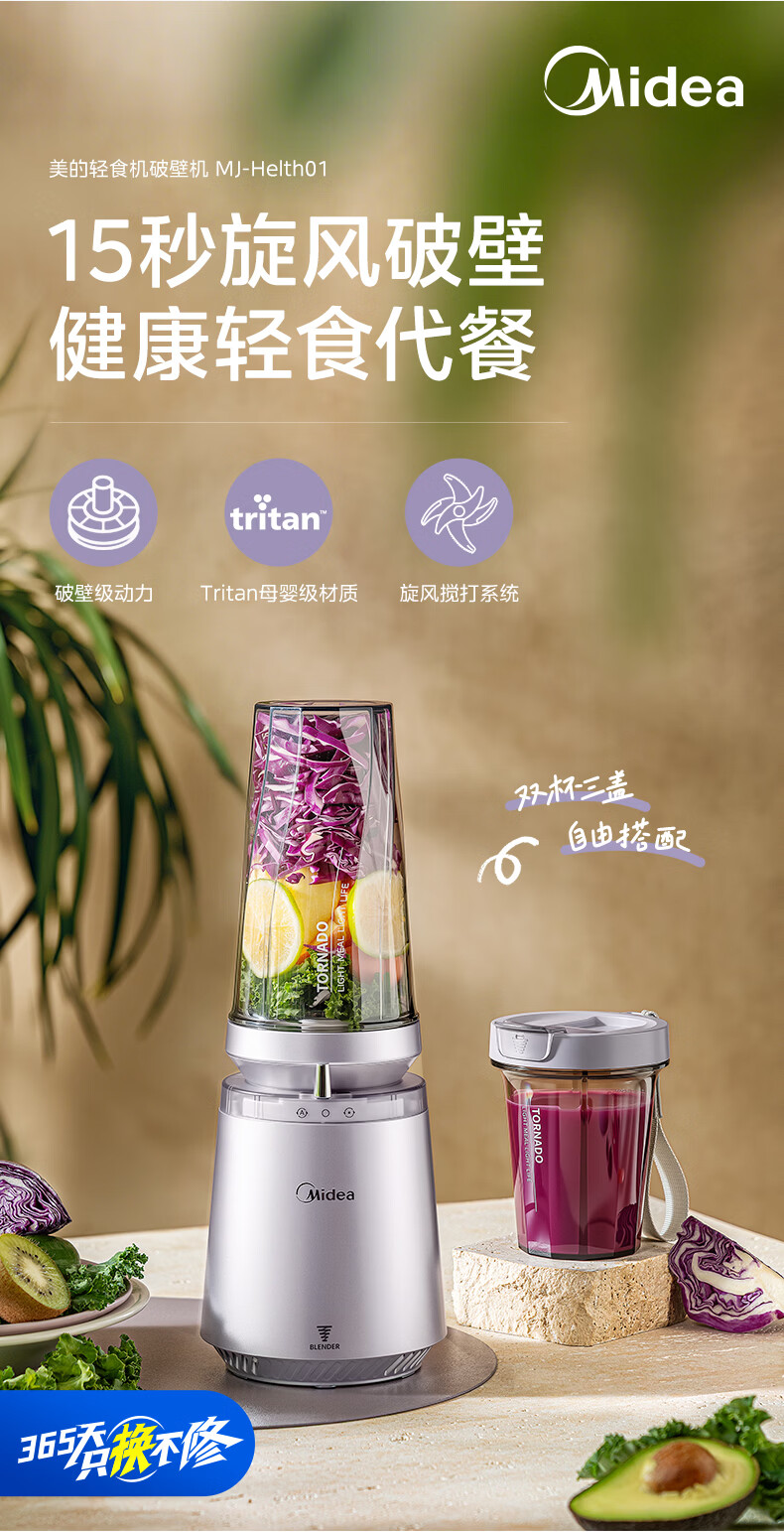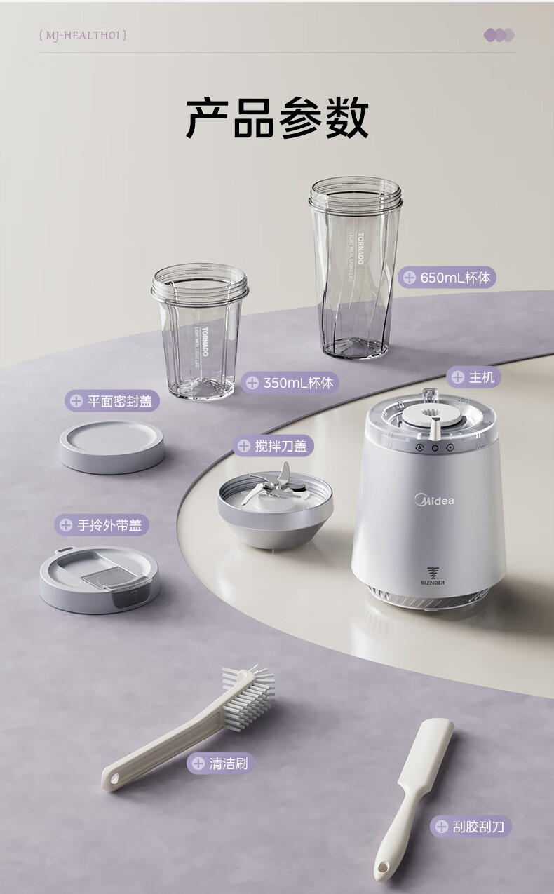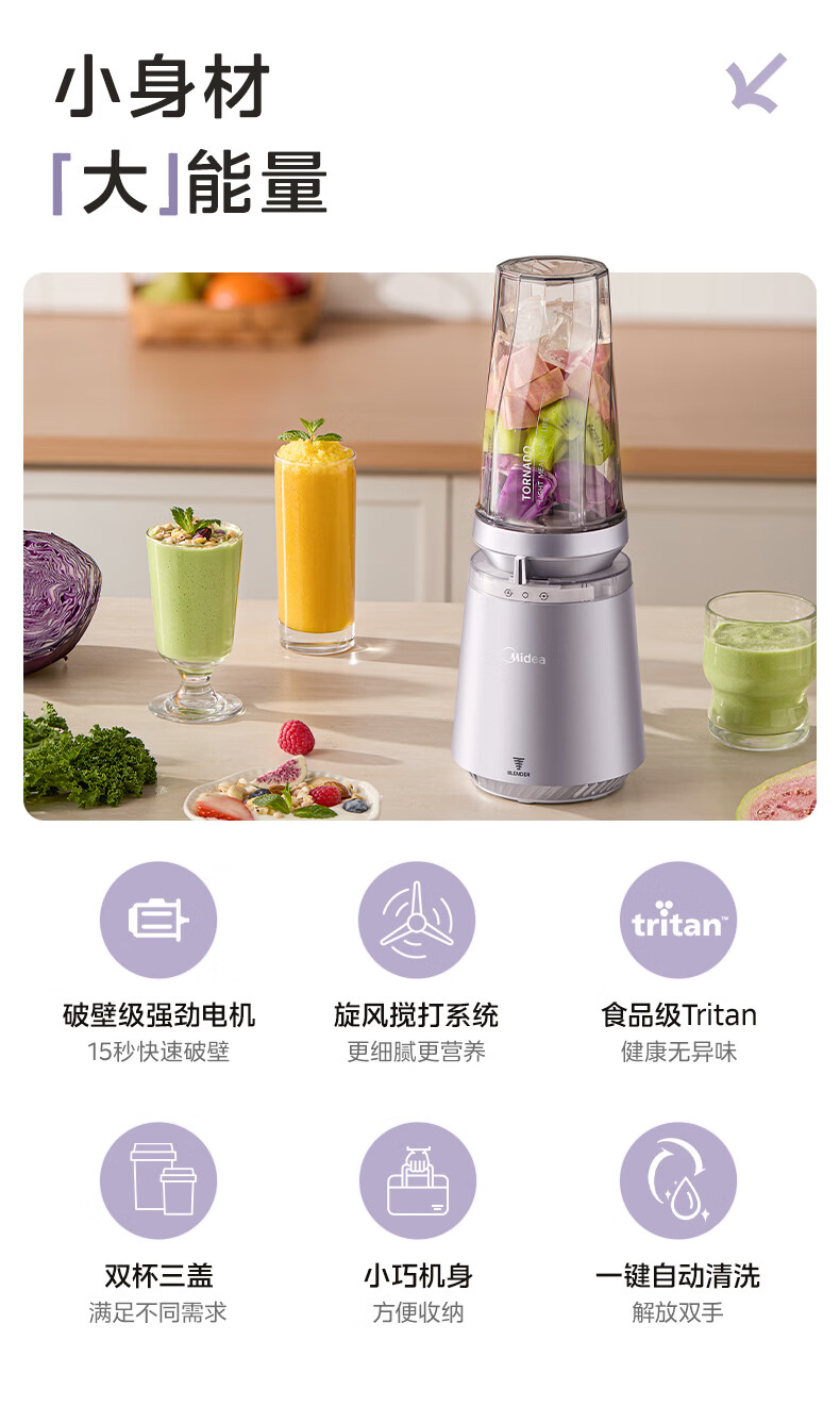美的(Midea)小蛮腰15秒轻食破壁机 家用小型全自动大功率果蔬榨汁料理机【650ML+350ML双杯】MJ-Health01紫