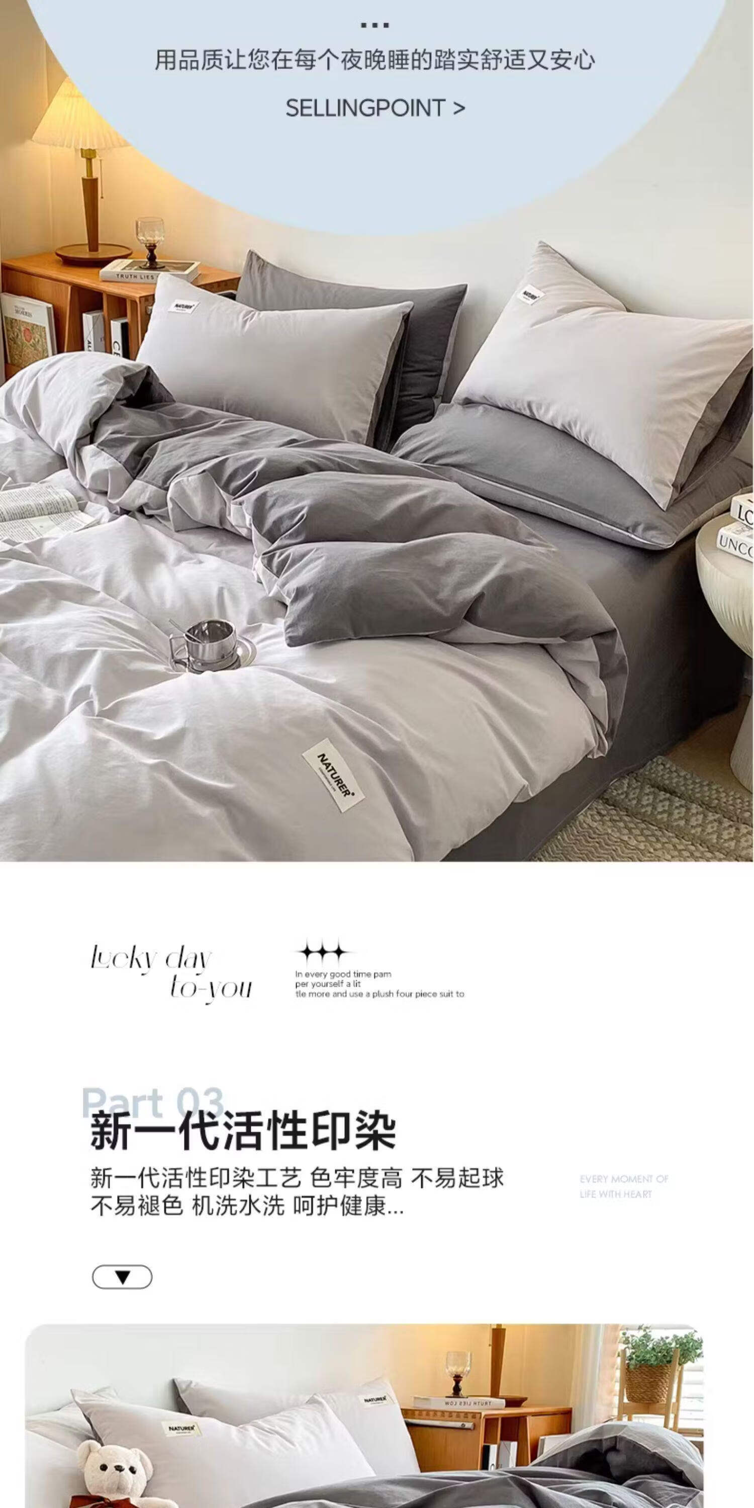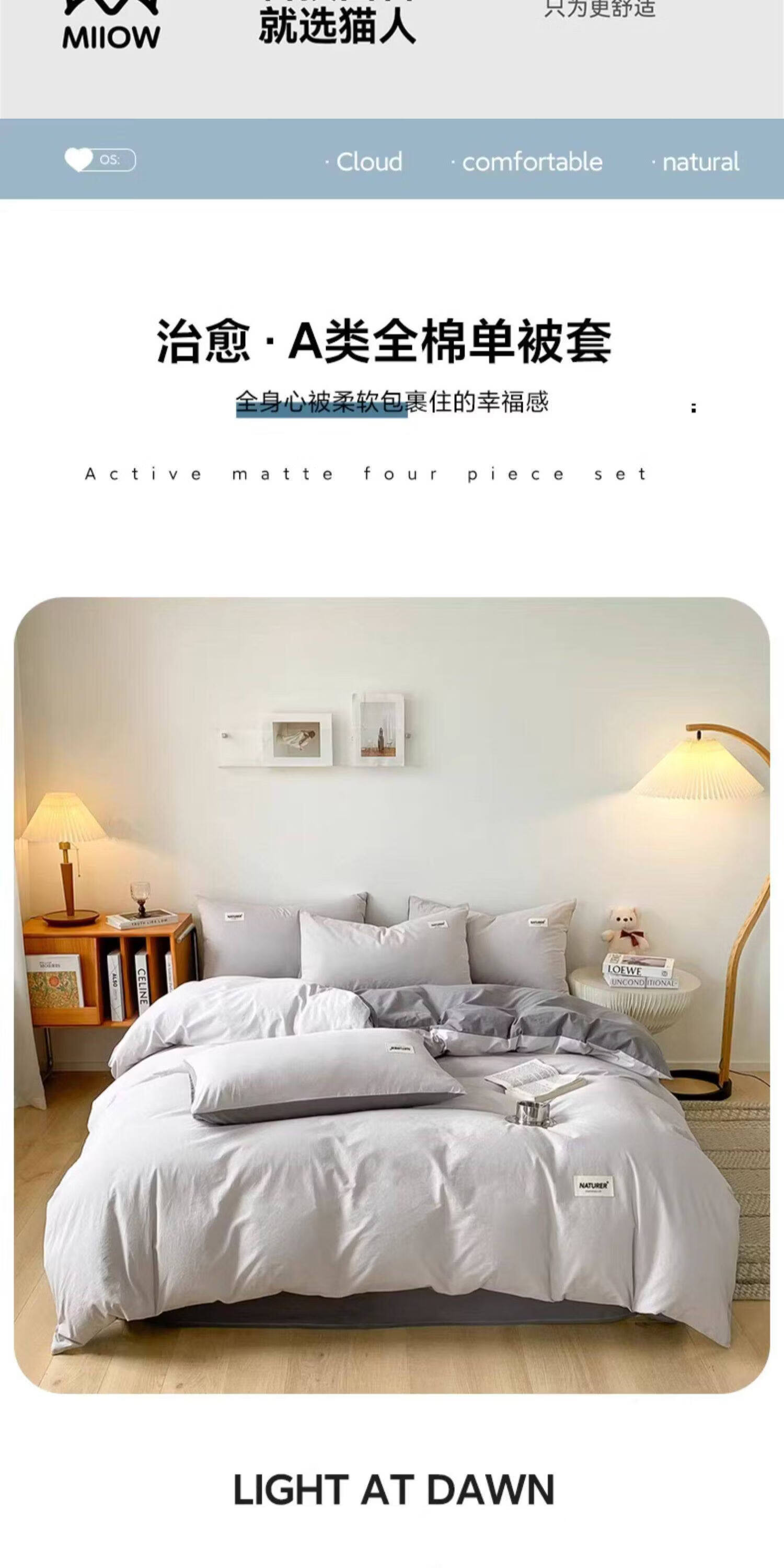 猫人(MiiOW)全棉床单被罩四件套床上用品纯棉被罩150x200x230cm床笠款三件套 海青+山灰【全棉面料 舒适透气】 1.5m 床单款 四件套-被套200x230cm
