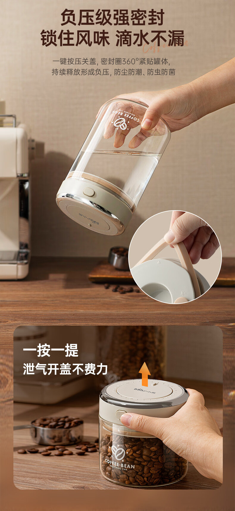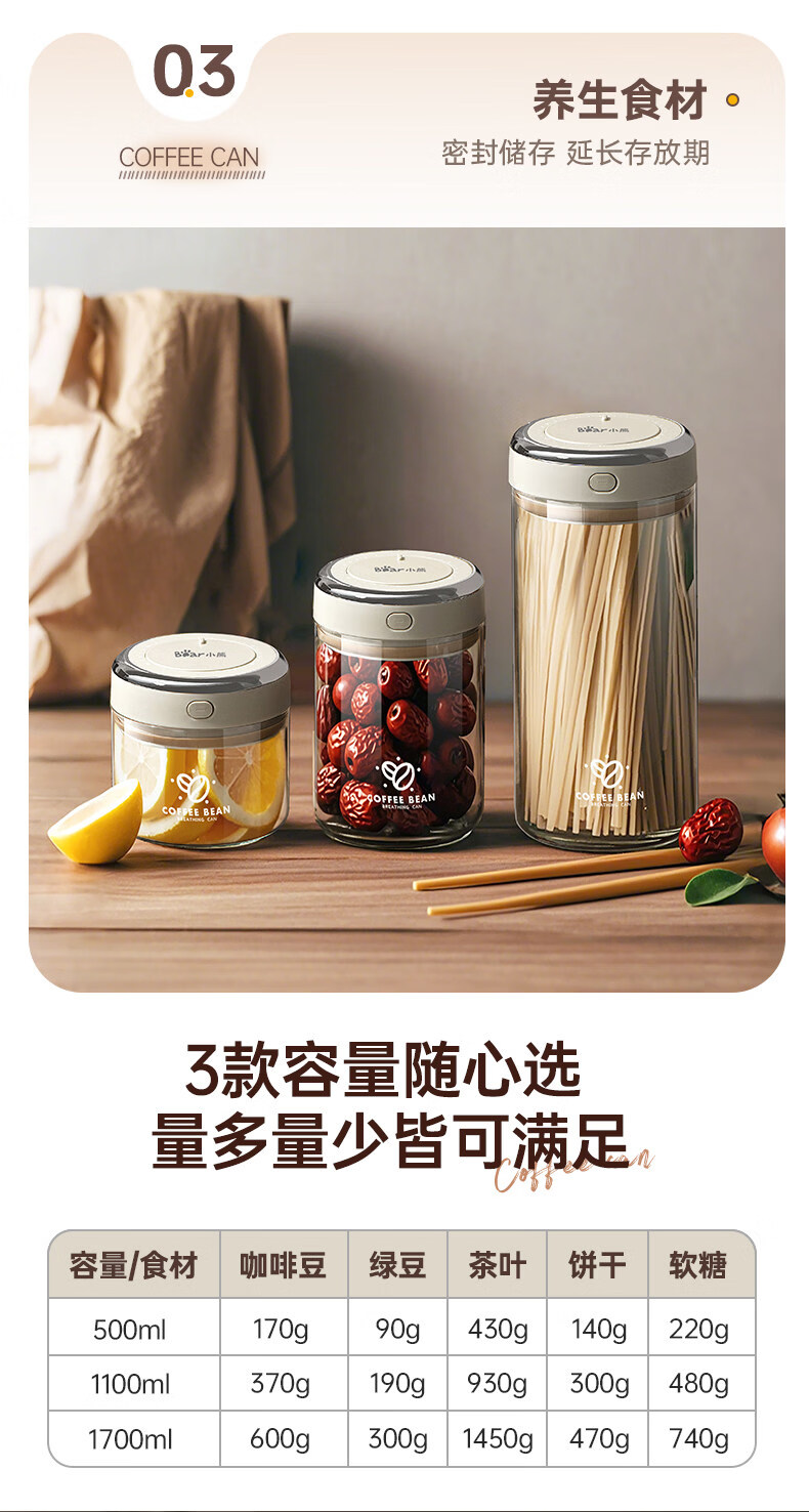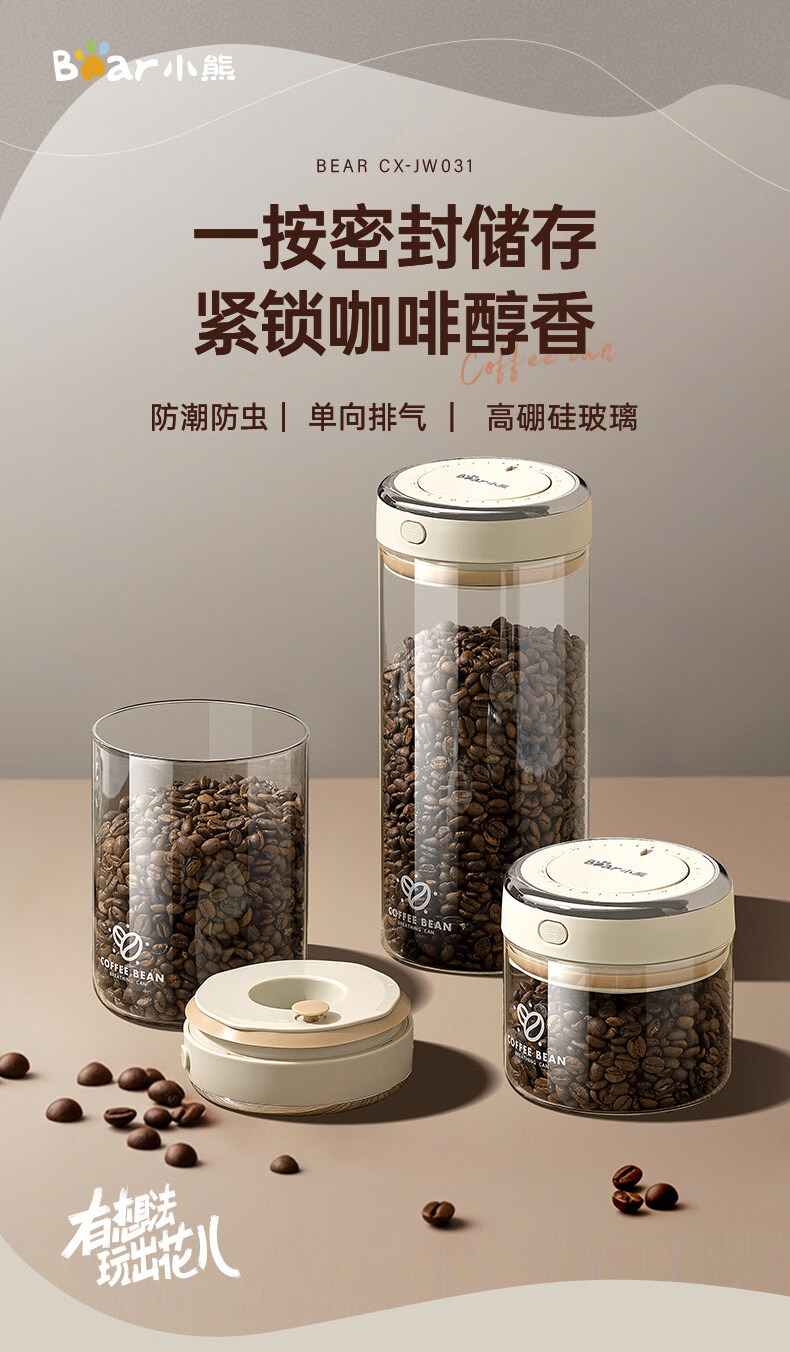 小熊(Bear)咖啡豆高硼硅玻璃密封罐食品级瓶子家用保存罐奶粉茶叶陈皮存储罐 负压级强密封 1个 500ml CX-JW031-P01