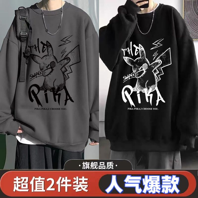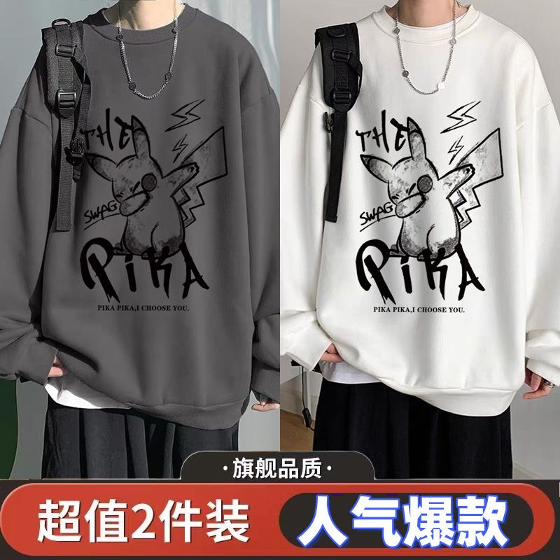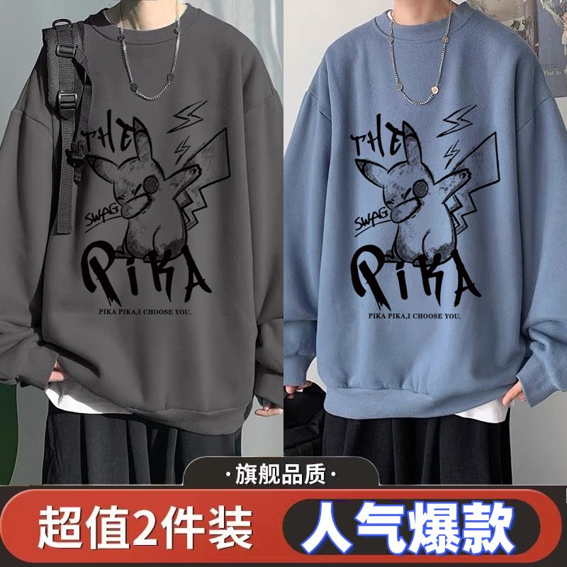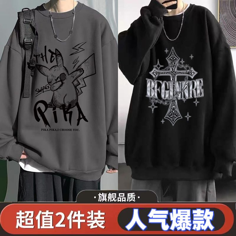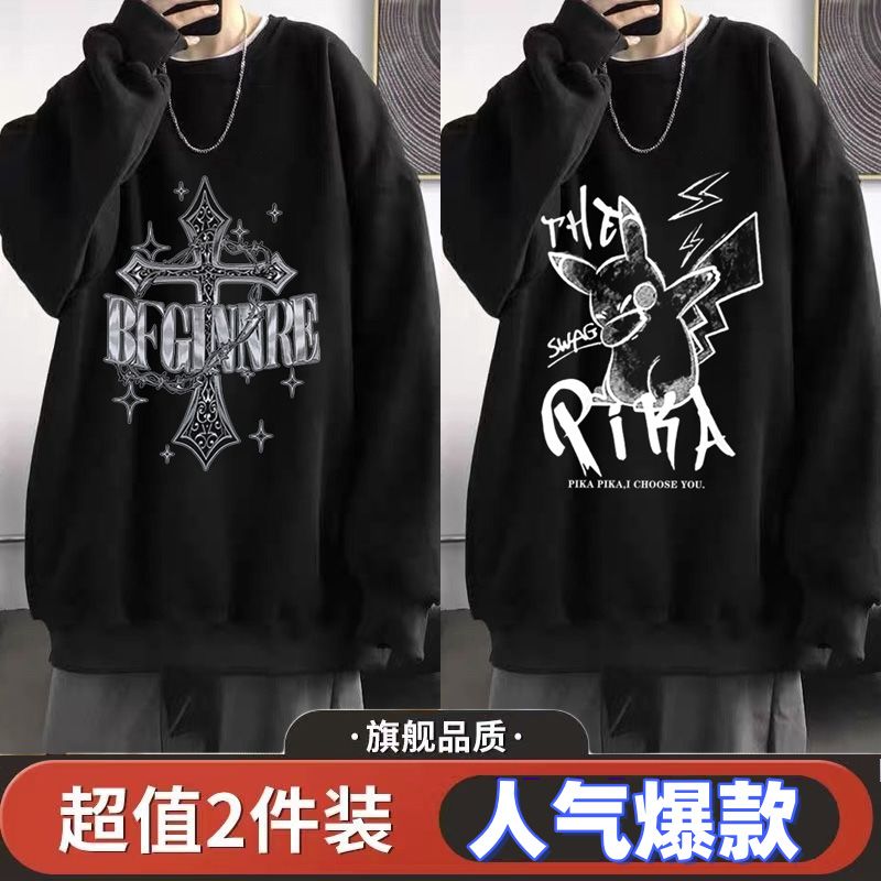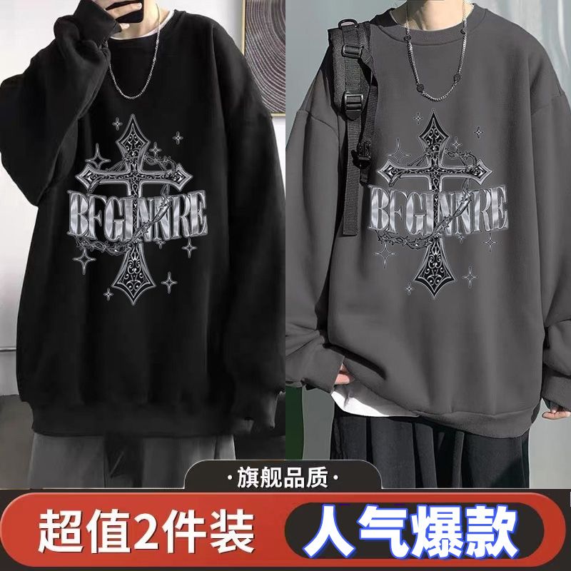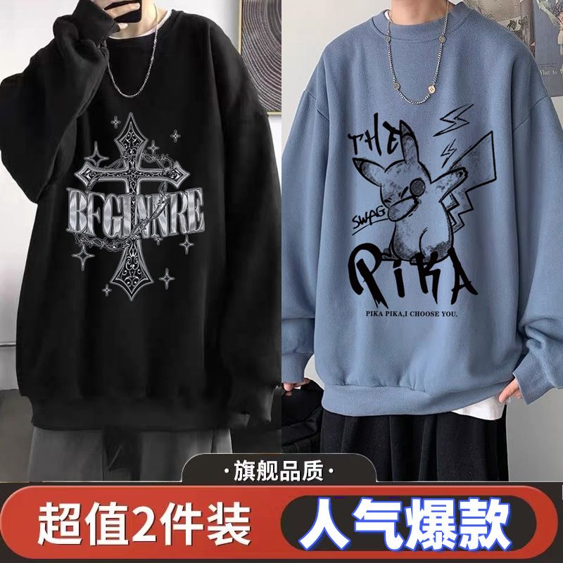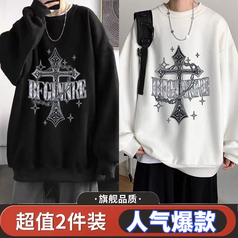 100%两件百搭套头圆领卫衣男生美式休闲宽松薄款无帽上衣男装潮流