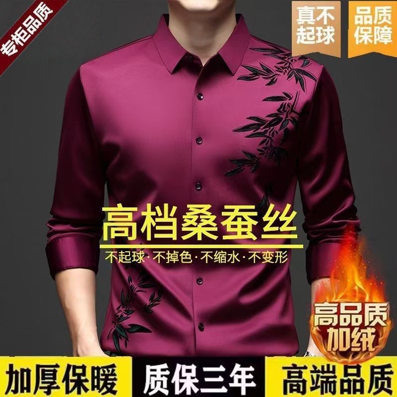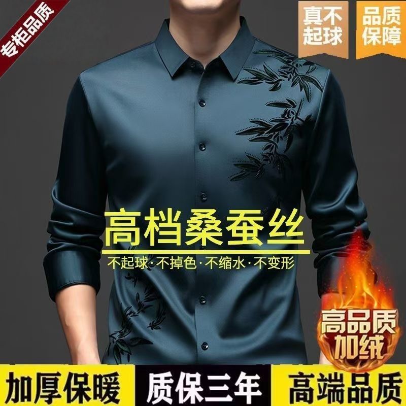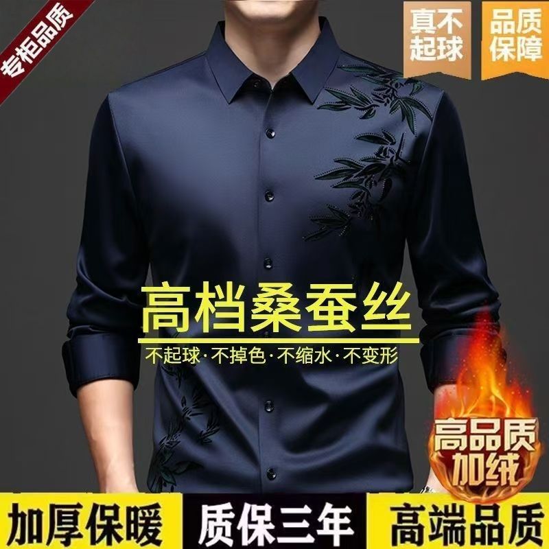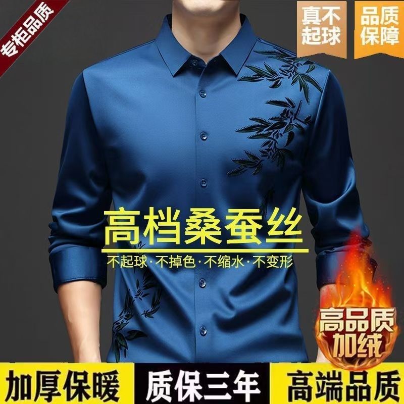 断码特价冬季男桑蚕丝无痕抗皱休闲免烫衬衣加绒加厚保暖衬衫竹叶